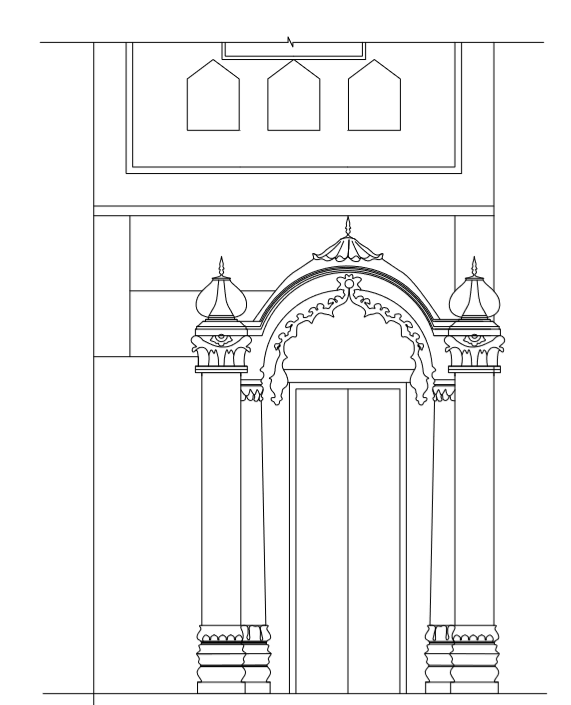 Previously, it was a gorgeous structure that has been renovated and restored without following ethics of heritage conservation. Only gateway of the original architecture exists. The arcaded gateway is foliated. There are floral designs on the arches. Two small domical structures topped with inverted lotus and finial type of designs rest on the pilasters. There is a hanging eave resembling to Bengali Chhatri is superimposed over the entrance arch. The facade is ornamented with floral designs.