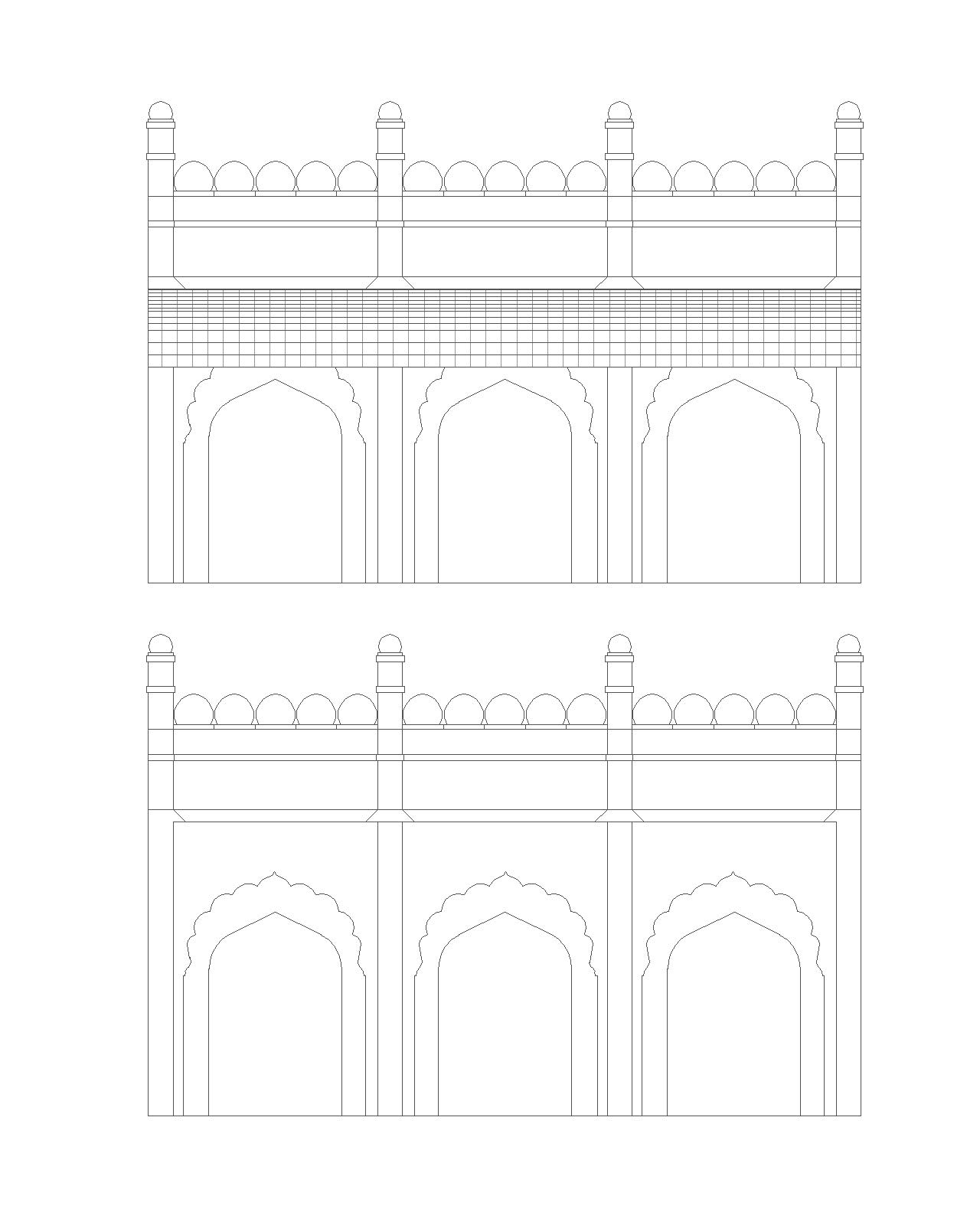 It is a three-bay-wide building. It has a vaulted roof with an outward extension, roofed by a tin sheet that appears to be a later addition. The parapet wall of the structure has multiple small minarets with domes. The main structure has arched entrance.