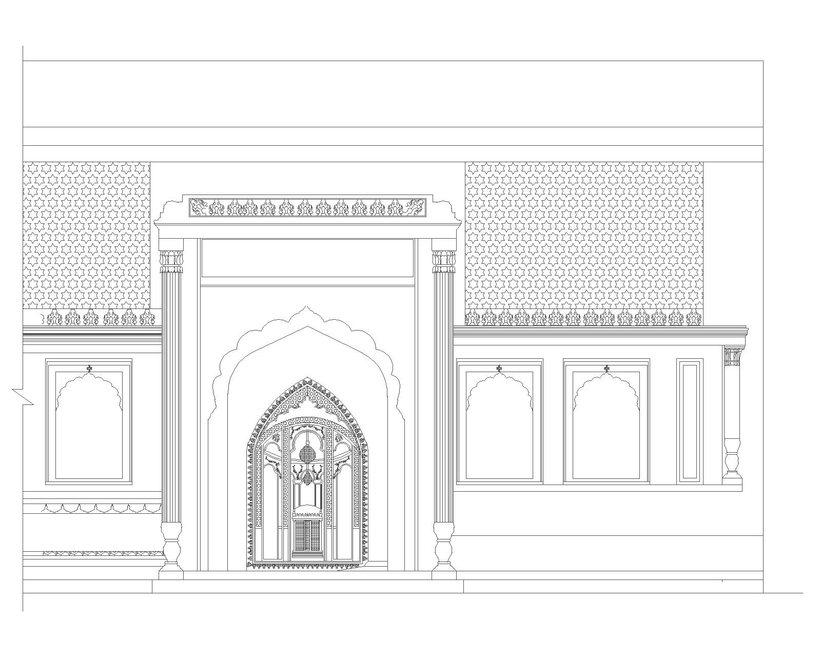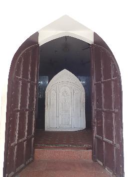 The entrance is through a projected gateway which has multifoliated arch enclosing the pointed arch. There are pilasters on either side of the gateway. Above the entrance there is a leaning chhajja. Front wall has glass work and other decorative elements and marble work is visible on both the sides. The building is renovated by adding flat roof and marble walls. Interior of the renovated structure is highly Decorated with glasswork, Stucca and marble.