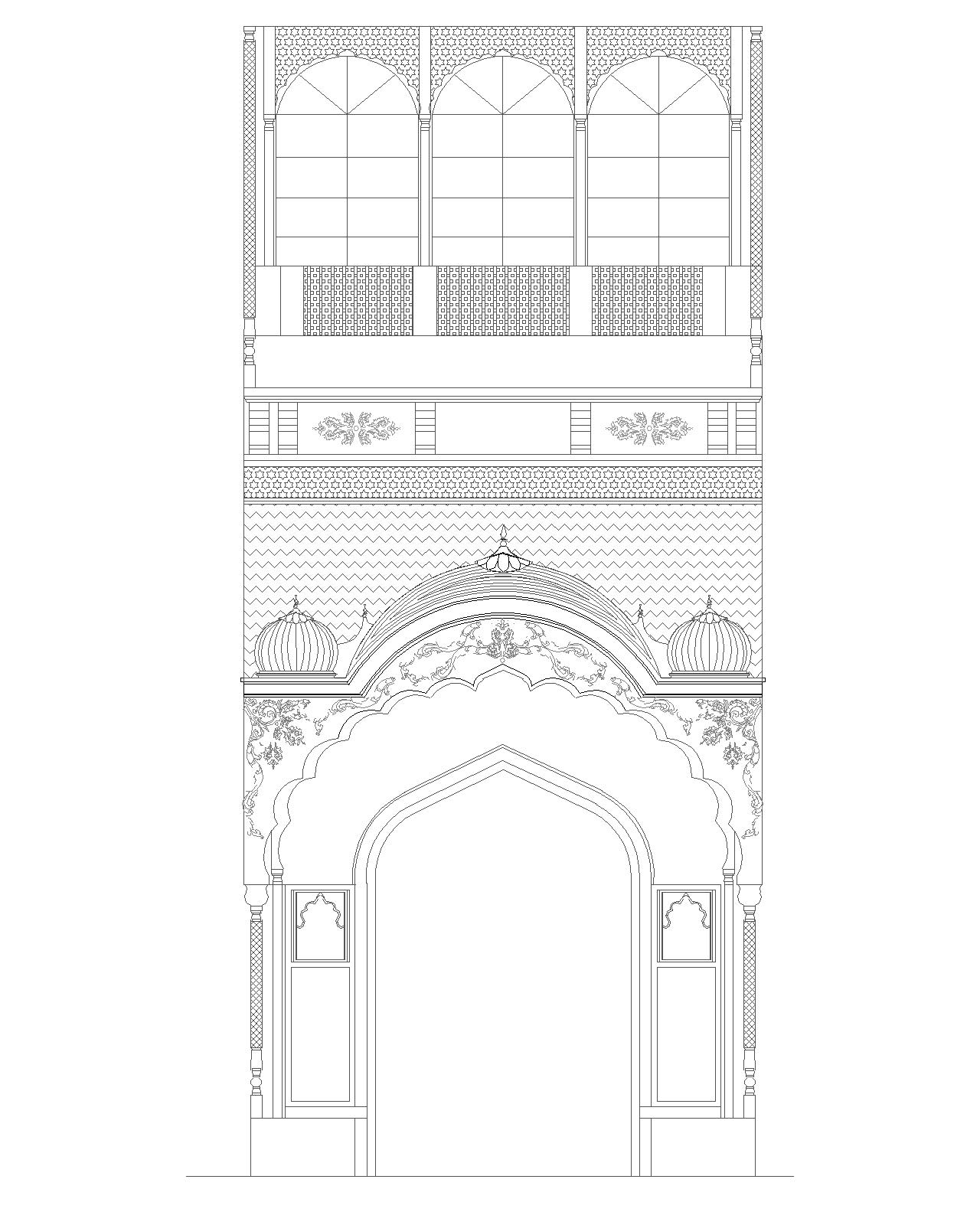 It is a multi-foliated arched gateway. Over the gateway there is a projecting semi-domed covering. The ornamentation in stone is very intricate.There is a typical late Mughal projecting balcony on the first floor, with three cusped arches supported by slender columns. Fa ade has very delicate carving on the spandrels of the engrailed arch. Brackets on the top support a projected balcony that appears as a later addition.