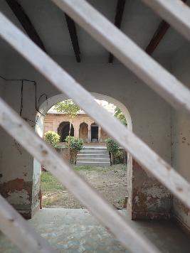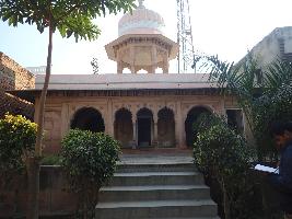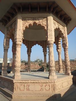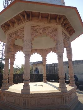 The magnificent multi-cusped arched gateway leads to the courtyard where the Samadhi building is constructed. The structure is raised on a rectangular platform which is approached by a flight of steps. The arcaded dalan running all around the square chamber. The front portion of the dalan has three multi-cusped arched openings in the centre and trefoil arches on each side of the central arched opening. Spandrels of the arches are ornamented with carved roundels and floral motifs. The ornate circular columns and rectangular pilasters support the arches. The rectangular chamber is constructed around the Samadhi which has central rectangular opening and the arched opening on either side of the central arched entrance. The ornamented arched niches are on either side of the central doorway. The chhajja is supported by stone brackets. There is a staircase which leads up to the roof .Over the Samadhi chamber roof there is a magnificent domed pavilion . The pavilion is raised on the octagonal platform and has ornate multi-cusped arches on the all eight faces which are supported by the ornamental fluted columns the chhajja of the pavilion is supported by the stone brackets .The pavilion is roofed by a bulbous dome which is set up on a drum. The base of the dome is decorated with floral design and it is crowned with an inverted lotus and a finial.The structure of the Samadhi is now restored and renovated and it is one of its kind in the village Mitraon.