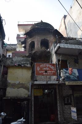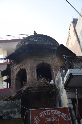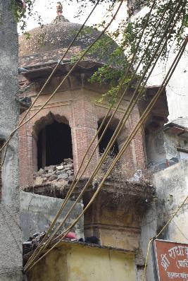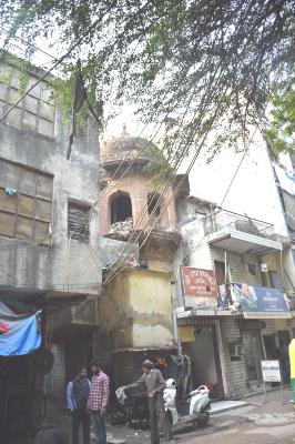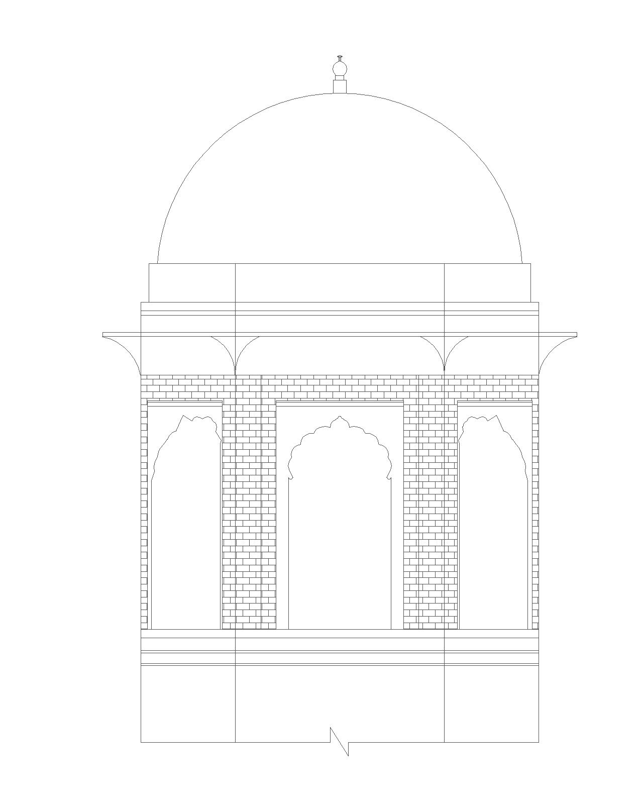 The lower portion of the chattri and drum are unidentifiable due to modern residential structures that have encroached over this historic space. The upper portion has an octagonal cupola with multi-foliated arched openings. There is an octagonal cornice above the openings surmounted by a globular dome with inverted lotus and a finial at the top.