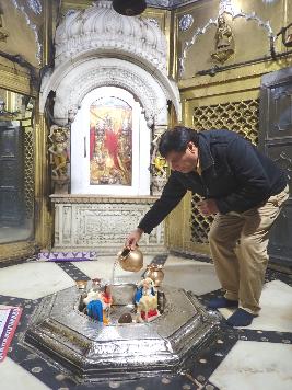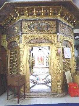 The projected square entrance has decorated area on both side and based on rectangular plan. Main shrine is based on octagonal plan with canopy above it. Main shivling is surrounded by silver. The structure has a ripped dome which is not visible from outside. Side walls have decorative motifs. Floor is made up of black and white marble. The walls of main shrine is elaborately ornamented from outside as well as from inside. |