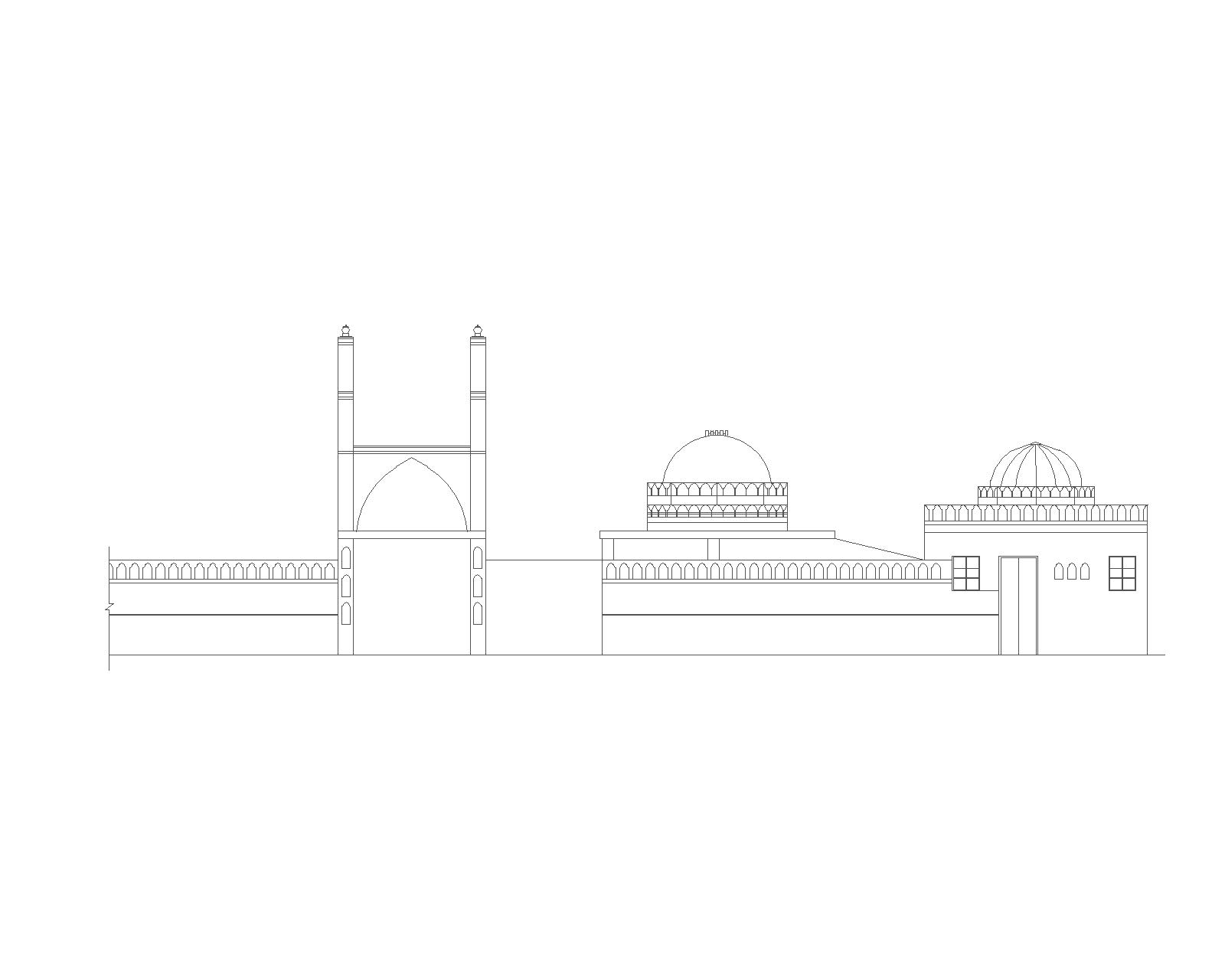 The mosque is built on a rectangular plan and is surrounded by a walled boundary. The wall has battlement parapet on it. The corners of the boundary wall have tall rectangular minarets surmounted with ribbed domical shape design and finial over it. Mosque is entered through a grilled square gate, above which an arcuate design has been made and two rectangular minarets are standing along with it. Within the boundary there are two domical structures. One domical structure has ribbed dome while the other dome is constructed upon a drum having battlement parapet design and crown shaped cresting.