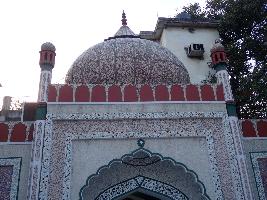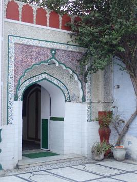 It is a single storey masjid which is built on a rectangular platform. The entrance has a recessed arched multi-cusped and pointed opening with similar but smaller arches on its either side. The main entrance has piers on its either side. The roof has a battlement designed parapet with large bulbous ribbed dome which has an inverted lotus design with finial on top of it. The structure is renovated and decorated with tiles and mosaics. |