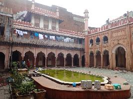 The madrasa building along with a mosque is shrouded in haphazardly constructed urban area which overshadows the structure. The multi-cusped arched gateway leads to the central large courtyard. In the middle of the courtyard a large rectangular water tank, which has trefoil shaped faces width wise , is constructed for the purpose of ceremonial ablutions before prayer and other religious rituals. On the western side there is an impressive mosque which has arcaded openings, arched niches, minars, parapet adorned with kangoora pattern and bulbous domes. The northern and southern sides comprise the double storey structure and also either side and top of the main entrance. The arcaded corridors on ground level are on the four sides punctuated by main gateway. The multi-cusped arches supported on the columns of sandstone from the outer face of the corridors and give access to the rooms of the madrasa. The projected chajja is supported by the stone brackets. The upper storey also has rooms on all three sides. The circular columns, lattice railings, mouldings, kangoora patterns, multi-cusped arches and small pointed arched niches are some of the features which highlight the aesthetic value of the heritage structure. The mosque has eight openings and an inscription over the central one. the first floor has a terrace over the verandah. |