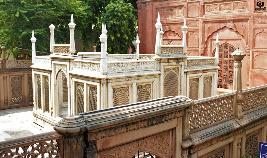 The tomb is made of ornate white marble. It is surrounded by elaborately carved screens depicting floral patterns of Mughal architecture. |