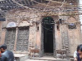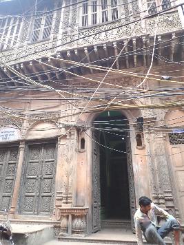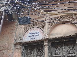 The entrance of this building is through a semi-circular arched gate with a wooden door. The piers have beautiful vase type motifs at the base. The projecting first floor balcony is supported by sandstone brackets. The building has a highly decorative and ornamental facade with intricate carvings on sandstone. The front door has ornamental carvings. The balcony railings have an ornamental stone screen. |