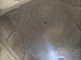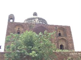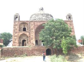 It has a bulbous dome supported on a circular drum and decorated with petalled design at the base. There are four kiosks at the front. Within the enclosed walls, there are three graves placed in the center beneath the dome. The structure has been made on a raised platform. Cupola chattirs have been built at the corners. The central dome is surmounted by a small cupola structure. One of the cupola chattris is missing at the corner. It has a pointed arch with niches on either side. |