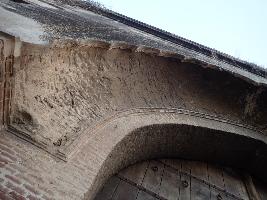 It is a two story structure with rectangle ground plan. The facade has has a multi foliated arch with arcaded entrance along with wooden doors. The entrance has arched design window on either sides. The first floor has three windows on the center and two windows on either side aligned with the windows on from ground floor. |