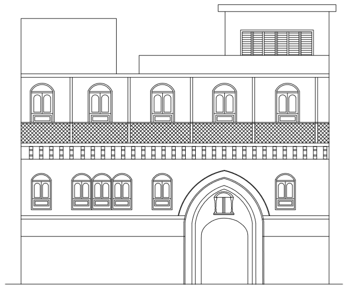It has multiple recessed arches, having florentine pattern. Roundel arch for the entrance is also having freezes. Projected balcony with brackets add aesthetic charm to it. The courtyard has pointed arch. It is a two-storeyed building. Courtyard has three side openings having three pointed arches on all the sides. It consists of pillars with floral capitals supporting the second floor. Some new pillars have also been added.