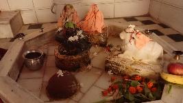 The structure is built using bricks and plastered with cement. The floor is made of marble. The walls are inside the sanctum are covered with tiles. |