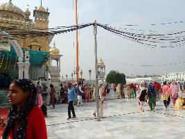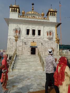 The upper portion of the edifice is covered with glittering gold plated sheets. The lotus dome, damaged in an earthquake 4 April 1905 and subsequently reconstructed has an ornamental gold pinnacle with an umbrella shaped gold finial. Exquisitely executed stucco work in intricate designs, inset with reflecting glass pieces, decorate the interior walls and the ceiling. The Guru Granth Sahib is seated on a platform under an elongated dome covered with goldplated metal sheets. This throne was an offering from Kanvar Nau Nihal Singh. A relay recital of Kirtan goes on from early morning till late in the evening. |