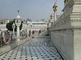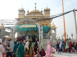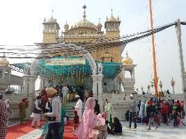 This is a Gurudwara made on a rectangular plan and is approached by a semi circular arch having decorated pillars on its either side. There is a flight of stairs inside the arch entrance leading to the main shrine. The main building has decorated Bengali Chattri in center with cupola chattris surrounding it. The structure has circumambulatory pathway and a water tank with metal railing all around it. There are other subsidiary structures around the main shrine. |