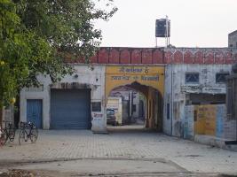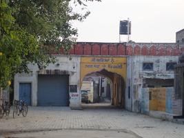 The structure has a multi-foliated arch and parapet railing above it. There are two rectangular gates adjacent to it. |