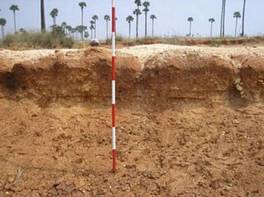 Artefacts occur on the surface of the weathered gneiss and are embedded in the top 5 cm of the murrum. These are capped by reddish sandy-silts which are being quarried. The area is quarried. Artefacts when seen, occur sporadically on the surface of the weathered gneiss. |
