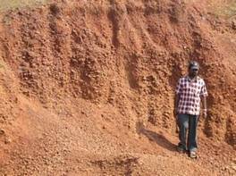 The artefact horizon comprises an indurated ferricrete gravel around 20-30 cm thick, with artefacts often embedded within the duricrust. This overlies a Cenozoic laterite profile Unit 3 , base of which cannot be seen. The site is extensively quarried and disturbed, owing to both quarrying and road construction which dissects the area. A very low density of tools is seen across the area, only around 1 to 2 artefacts m2 although the density increases as one moves west across the site. |