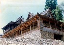 Stone and wood masonry katth-kuni . Wooden doors and balcony. Slates on roof.