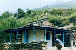 Stone and wood masonry katth-kuni . Wooden doors and window. Slates on roof.