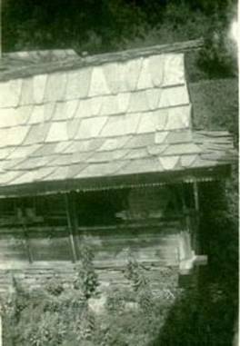 Stone and wood masonry katth-kuni . Wooden doors, stairs and balcony. Slates on roof.