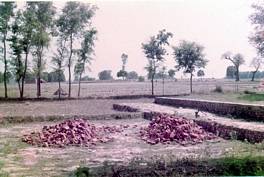 The area of the mound is approximate 100X50 meter and is being under cultivation. The site yields potsherds of red ware on medium fabric. |