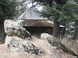 The present temple is a relatively recent construction and seems to have been rebuilt in the mid or later part of the 20th century. It is a single storey structure with a garba-griha consisting of a large monolithic shiv-lingum in the centre. The outer chamber or the circumambulator is in the form of an open verandah with a wooden railing all along the perimeter. A low-height pyramidal roof, with a copper kalash or finial, surmounts the temple roof which is covered with CGI sheets. The temple is the only building on the mound ahead of which the area becomes densely forested. |