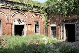 The house is a traditional courtyard type with rooms arranged round the square courtyard which served as a private space. The range of the house facing the road also has a centrally located decorated gateway which is set within curved recessed arches made by moulded bricks. The rooms are tall and large with exposed timber ceilings. The building has been exceptionally ornamented using moudled brickwork and corbelled bands. The fenestration details are also highly decorative. There is a side staircase which goes to the terrace floor of this essentially single storey building, although there is a half first floor along one length of the courtyard house. |