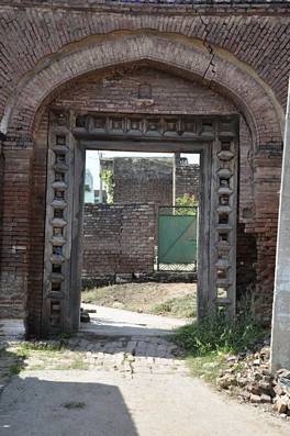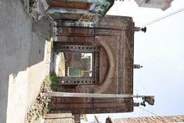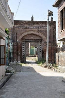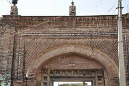This is apparently one of two entrance gateways leading to the Nagri town. The square gateway is of fairly decorative quality and about 20ft high. The gateway is double faced with cusp-arches on both faces. The gate is inserted with a thick wooden door which is lost and the huge wooden frame of the door remains. The brickwork radiates from the centre of the arch all around the face of the gateway. There is a square tile-work band surrounding the arched opening of the gate. The sides of the arched opening are adorned by decorative brick pilasters. |