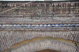 The main component of the building material is lakhori brick, baked and coloured tiles and wood which still exists in the form of door frame. The brickwork is exposed and highly ornamental in quality. Much of the fabric of the structure and its adjoining wall is victim to pilferage. |