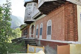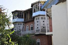 The house is constructed in exposed brick masonry which is lime-pointed. The corners of the building are strengthened octagonal piers, using stretchers of timber one over another and filled with bricks. This helps the structure to withstand earthquakes effectively. Timber is also employed for floor beams and joists. In place of the common lattice-work, window panels are substituted by decorative iron jaalis. Most of the windows are pointed arched and still retain the original wooden panels. Even the perimeter wall of the house is traditional stone wall which is tied together with long pieces of timber. |