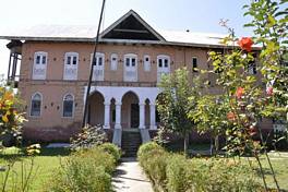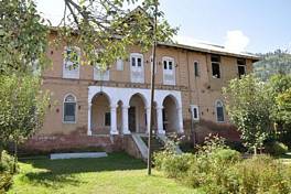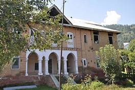 The high quality building is laid out on a sprawling site with a traditionally built boundary wall surrounding it. The entrance deedh or gateway leads to the property on the far end of the lawn. The building is prominently horizontal in plan with two floors. The front facade is fairly plane with no extensions etc, to highlight it. The house is defined by a high plinth and a centrally located porch comprising pointed arched openings created by series of robust brick columns. The rooms are arranged linearly along the length of the building. The first floor is highlighted by a series of segmental arched windows running the length of the building face. |