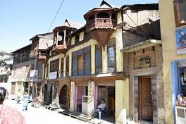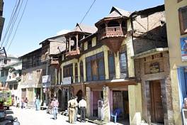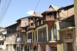 The ground floor has been greatly modified for the shops. Almost the entire ground floor seems to have been reconstructed for better shop-fronts. The first floor, however, has retained most of its original character and is constructed in dhajji-dewari where the timber framing is done using a rectangular frame making it appear aesthetically more sophisticated. Each window is set in between two timber studs. The widows, extending from the floor to the lintel level, comprise square frames with arched profile for the openings. The ceiling joists and floor boards are constructed in timber. Internally, the walls are plastered in mud zavil-bore . Wedge-shaped bricks fill-in in the timber framework. |