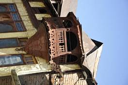 The enormous property is located on the main Ganpat Market road. Facing the road, the building is accessed by means of a large and highly carved and decorated wooden gateway set within the building wall. The gateway leads to the private forecourt around which a number of rooms are arranged in a linear series. The size of each room is fairly large but the largest room is in the form of a large hall on the first floor. This room supposedly was used for wedding gathering and the rest of the rooms for resting etc. While the main face of the building is largely plain, the most interesting feature, in the form of a unique dub or bay window emerges on the attic floor. The dubs are located at two ends of the building and have a floral wooden base. |