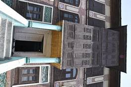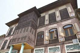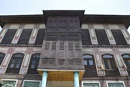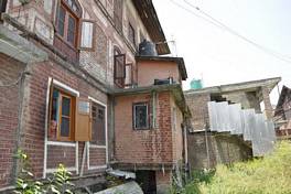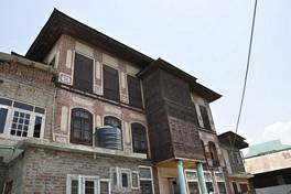 The second oldest of the residences in the complex, this building comprises a rectangular plan with three stories going up and a basement. From the main road on the west, one approaches the south fa ade having the main entry door within an ornate porch under the dub coming from the first and second floor. The porch has colonial-styled columns as supports to the traditional dub. It is a typical Kashmiri house with a rear staircase and a front lobby with rooms on either side. The basement is used as a store and is said to have withstood many floods. The ground and first floors have four rooms each, placed symmetrically around the staircase lobby. The third floor has a hall with two smaller adjoining halls linked by traditional wooden partitions. |