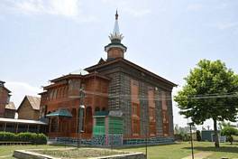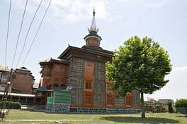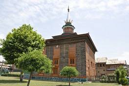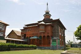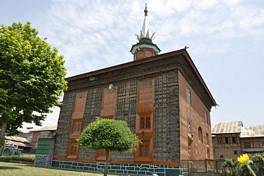 The khanqah comprises a two storey building built in the traditional Kashmiri wooden style of architecture. A unique feature of this architectural style is the way wooden blocks are used in a manner highly reminiscent of brick work, serving as alternative layers of headers and stretchers. The main entrance to the building is on the eastern side leading into a square double height chamber 50ft. x 50ft. . A narrow U shaped gallery overlooks onto the main hall, with a span of around 8ft. on the sides and 12ft. on the eastern side overlooking the hall. The building is surmounted by a traditional two tiered char-baam roof, surmounted by an octagonal brangh pavilion covered with a spire. |