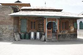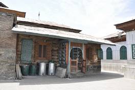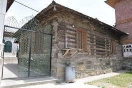 The Mosque comprises a single storey building built in the traditional Kashmiri wooden style of architecture. A unique feature of this architectural style is the way wooden blocks are used in a manner highly reminiscent of brick work, serving as alternative layers of headers and stretchers. The main entrance to the building is on the eastern side leading to a lofty chamber. The ceiling of the hall is supported on a series of wooden columns. The building is surmounted by a traditional two tiered char-baam roof, surmounted by an octagonal brangh pavilion covered with a spire. |