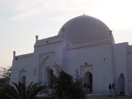 The mosque is built on a raised platform. It has a large hemispherical dome. East facade of the dome has three archways. Exterior part of the mosque is painted with white colour. Beautiful medallions can be seen on the spandrels. There are minarets above the facade of the structure. Two niches with kangoora pattern design can be seen on the main archway. Side archways freize consist circular and linear design. There are wooden doors with rectangular design which seem to be a later addition. |