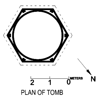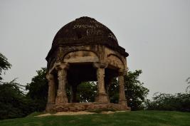 This canopy stands on an artificial mound and forms an excellent vantage point for all the surrounding structures. It is hexagonal in plan with stone columns minimally carved at each corner. Over the columns are flat lintels and semicircular arches in relief. The dome has Lakhori bricks arches in relief which springs about 1. 5 m above lintel level. There is inverted Lotus cresting on dome.