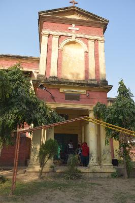 It is a north facing double storey structure with projected facade having four columns. Front wall of the building has one arched window and two rectangular window separated by pilasters. First floor of the projected facade has an alcove in the centre with keystone design. First floor is surmounted by Georgian Colonial design above which there is a holy cross symbol. |