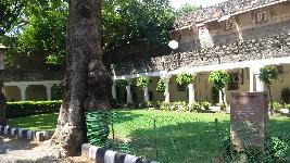 The building is made in a straight line with a circular projection at the centre and a few projections at the end. There is a corridor at the front. Facade is made with buff-colored sandstone columns that have a floral motif over the capital at lintel level. The rooms had originally height of about 6 m. The building is constructed and dressed by Delhi quartzite. At the ceiling there are square openings with sandstone Chajjas made over them. The rooms now have been provided with a false ceiling and the upper portion is inaccessible. The columns are decorated with floral motifs. |