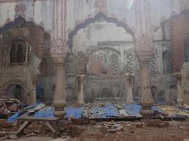 It is a double story building based on rectangular ground plan which has north facing rectangular courtyard entered through multicusped arched gateway which has floral design on Spandrels which is supported by decorated pilasters. There are multiple multicusped arched gateways on the three sides of the courtyard with series of pilasters. On the center of the courtyard there is a rectangular raised platform with a painted floral design on marble. On the southern side there is a raised platform which has step stairs on both sides leading towards three multicusped arches with medallion in centre and arches were supported by beautifully carved pillars with inverted lotus carving. Either side of the arches has arched window with the screen work at bottom. Southern wall has a multiple niches with multiple arched designs along with trellis pattern on it. |