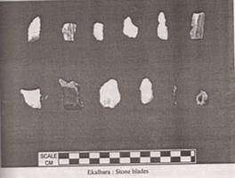1. Three trenches were excavated and observed five following periods. Period - I - Chalcolithic remains like black- and -red ware, mircoliths, beads and other related antiquities. Period - II Mauryan - Mother goddess in ivory, terracotta, beads and other antiquities. Period - III- Iron objects, pottery etc. Period IV - Stone beads, terracotta, pottery. Period V- Pottery, a peculiear earthen pot, locally known as Rajan, sherds of Mediaeval ware along with terracotta beads, miniature pots, lamp, Mughal coins. For prepartion of microliths semi-precious stones were used. |